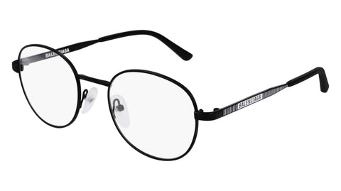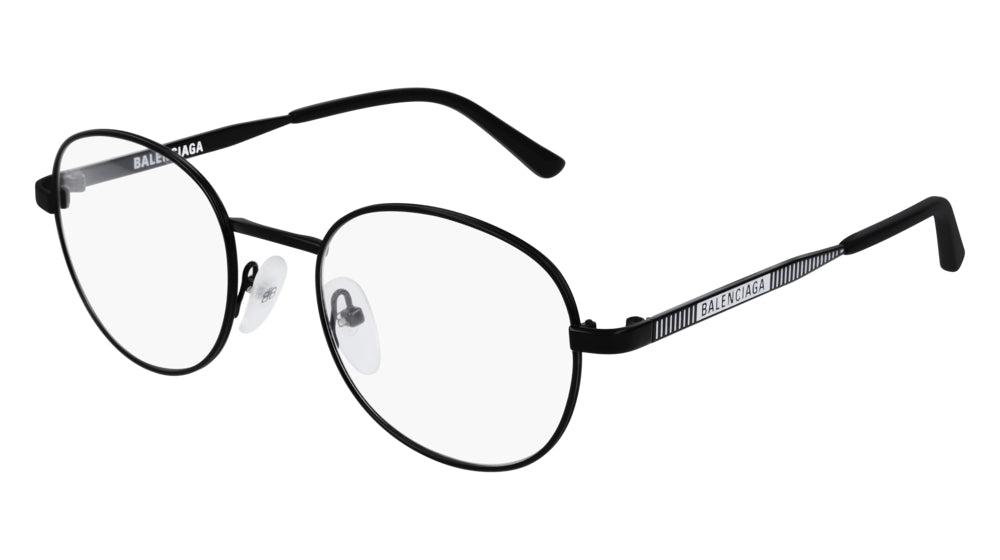 Classic unisex round shape Textured metal temples with Balenciaga logo and vertical stripes decorative motif in relief Acetate temple tips White finishing to exalt the branding on semimatte black sku Nosepads are adjustable