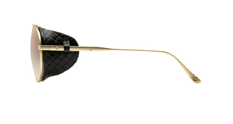 Strong and iconic pilot. Titanium master piece Made in Japan enriched by iconic Micro Intrecciato motif hot printed calfskin leather blinders. Distinctive semi spherical functional and aesthetical metal rivets hand-inserted using a traditional process. Bottega Veneta logo finely engraved on the integrated plaque hinge on the internal side of the temple.