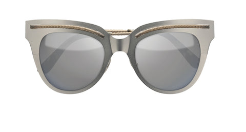 Feminine cat eye shape. SS 2016 Womenswear Fashion Show styles: fashion statement. Sophisticated functional metal construction. The cylindrical monel inserts with the Intrecciato motif on the front delicately join the temples creating continuity in term of design. Extremely light and thin without loosing resistance, elasticity and comfort thanks to high quality materials. Bottega Veneta logo finely engraved on the internal side of the end tip.