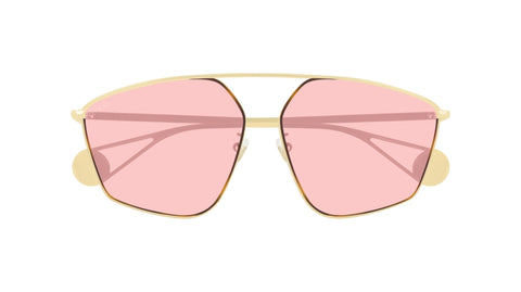 The aesthetics of the FW18 fashion show styles have been interpreted in this oversize shape without nose bridge. Light gold metal frame embellished with parabolic bridge surrounding colorful lenses. Gucci lettering logo on temples combined with interlocking GG logo on end tip. Sophisticated and colorful color palette.