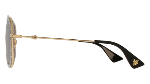 Trendy pilot metal shape, characterized by a sophisticated web printed treatment on plastic rim Small GG interlocking logo on temples, iconic Bumble Bee on the end tip and Tiger on leather nose. Different shades of blue color palette.