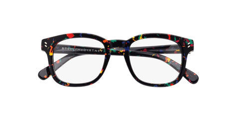 Easy to wear square style with colors inspired by Stella apparel and accessories collections. The double pins on the front and the engraved logo on the top of the temple are used as signature elements. The material used is sustainable bio-acetate, specifically developed for Stella McCartney Eyewear collections.