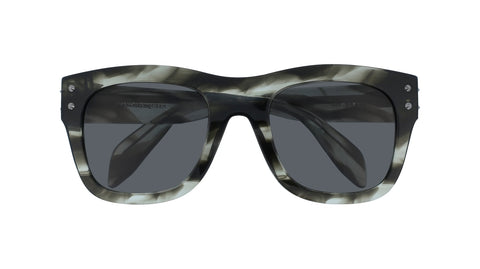4 rivets by side are making this concept unique. Very McQueen details that beautified this easy commercial masculine bold square shape. 4 colors available. classic black and 3 ways of havanas declinations. Rivet details on the lugs and temple sides with Alexander McQueen logo: metal sticker inserted on the temples and covered with transparent Epoxy qui gives a high quality perception.